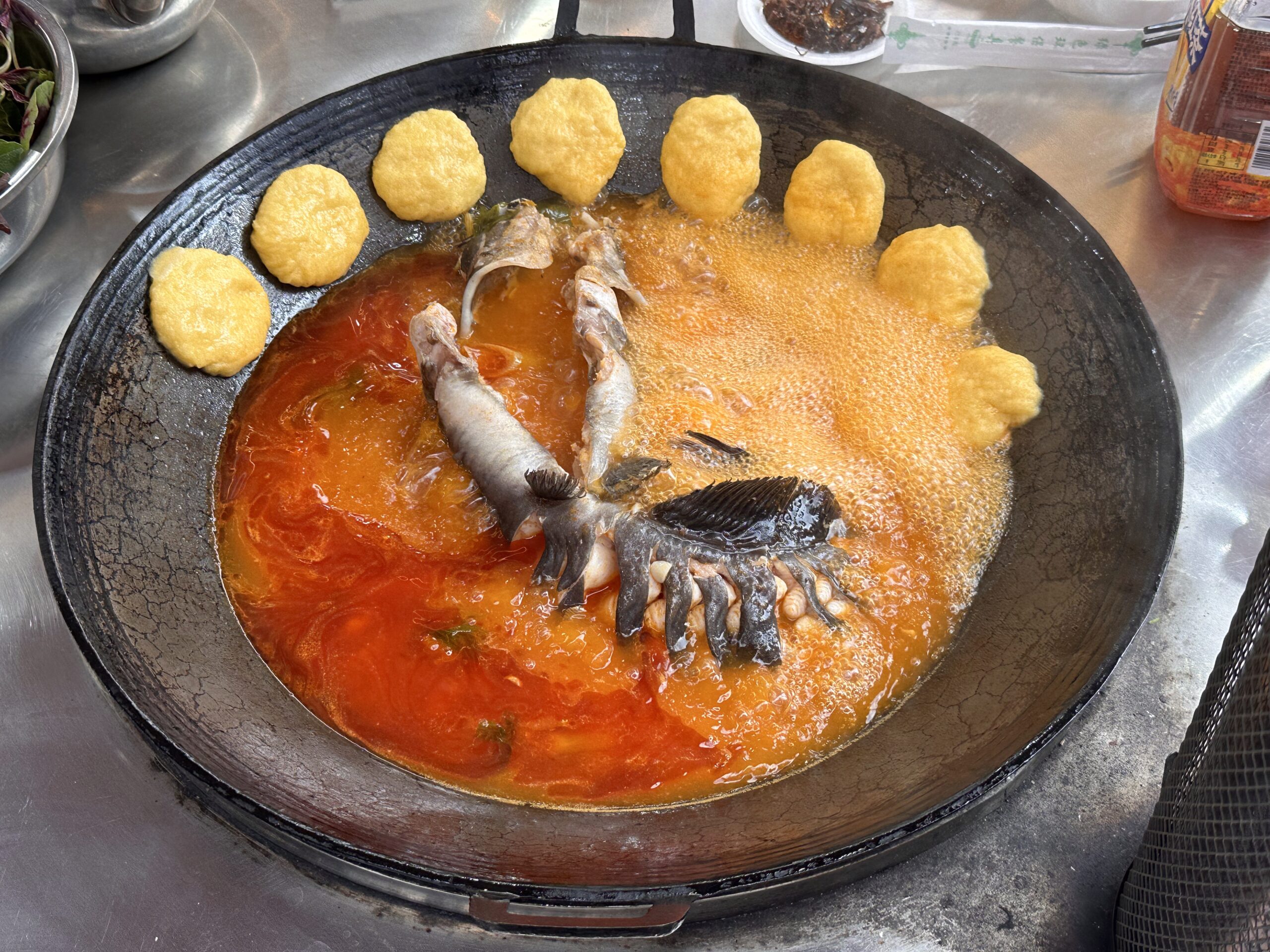 酸汤鱼的店座无虚席,我们点了一条 3 斤多的鱼,鱼的品种是“江团鱼”,两个人吃刚好。鱼是现杀的鱼,肉质很新鲜,配上酸汤和蘸水,确实很好吃,只是贴在锅边的饼让人感觉像是东北吃法,不知道这家店是不是把东北的贴饼结合了过来… 但不得不说饼也很好吃,毕竟是第一次吃,也吃不出正不正宗了。