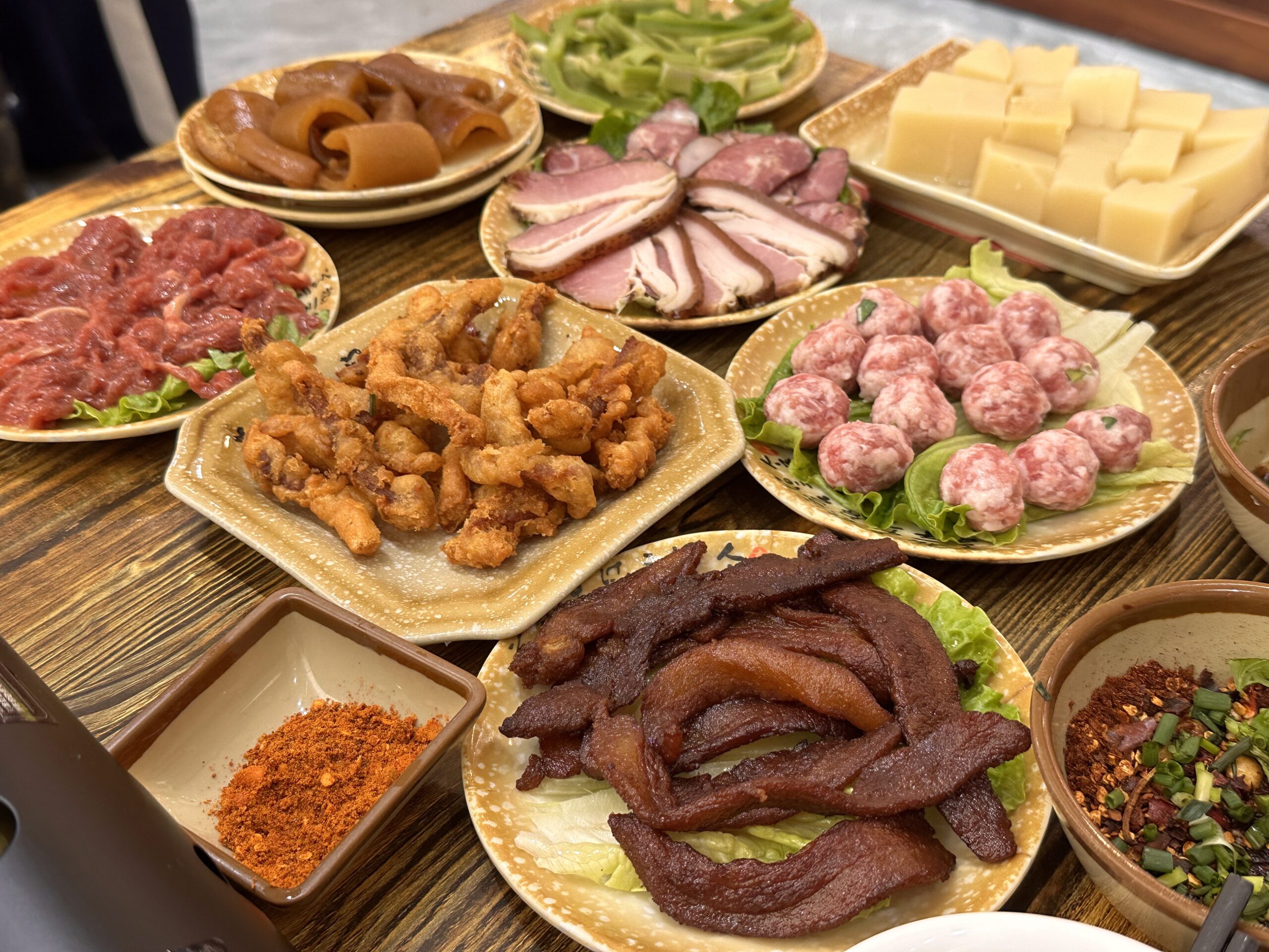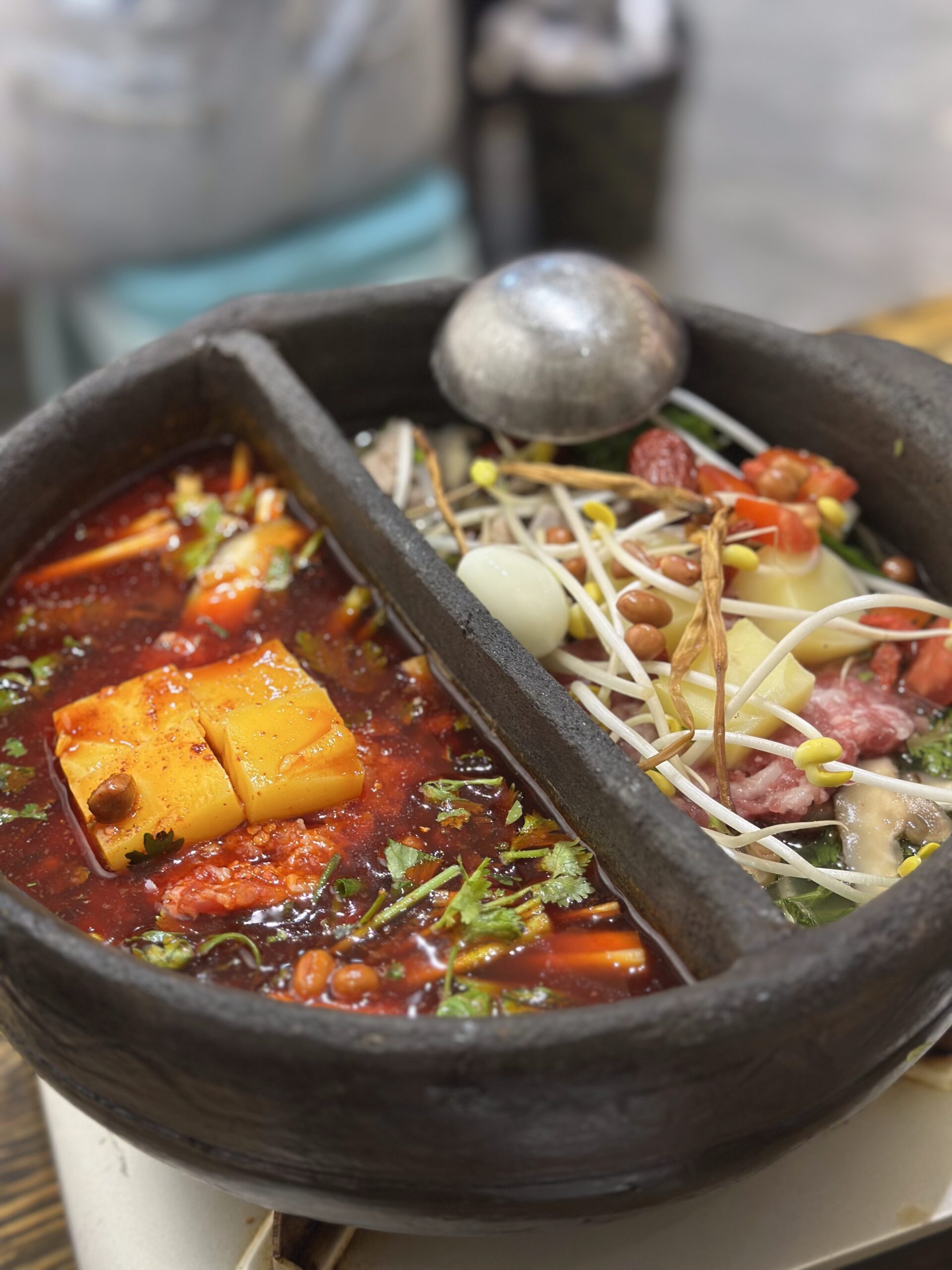 就此结束了无惊喜但疲惫的一天,但好在晚饭吃的很满意,我们找了一家「夺夺粉」的店,有点类似火锅,点了一个鸳鸯锅,一边是酸辣一边是三鲜,外加点了一桌的菜,去之前没有抱很大期望,但实际确实比较惊艳,特别是锅里的香菜,我虽是一个吃香菜的人,但一直只把香菜当做调料而已,但这个锅里的香菜好吃到可以单独当菜吃,完全出乎我的意料,此外在几个熟食里,软哨也让我觉得不错,有嚼头,香而不咸。