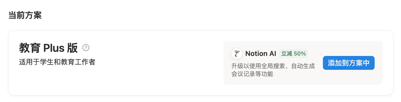 Notion 注册好之后,进入设置的账户界面——升级方案,拉到最下面就可以看到使用教育邮箱获得 Plus 的提示了,但我没提前截图,这里就不贴了。