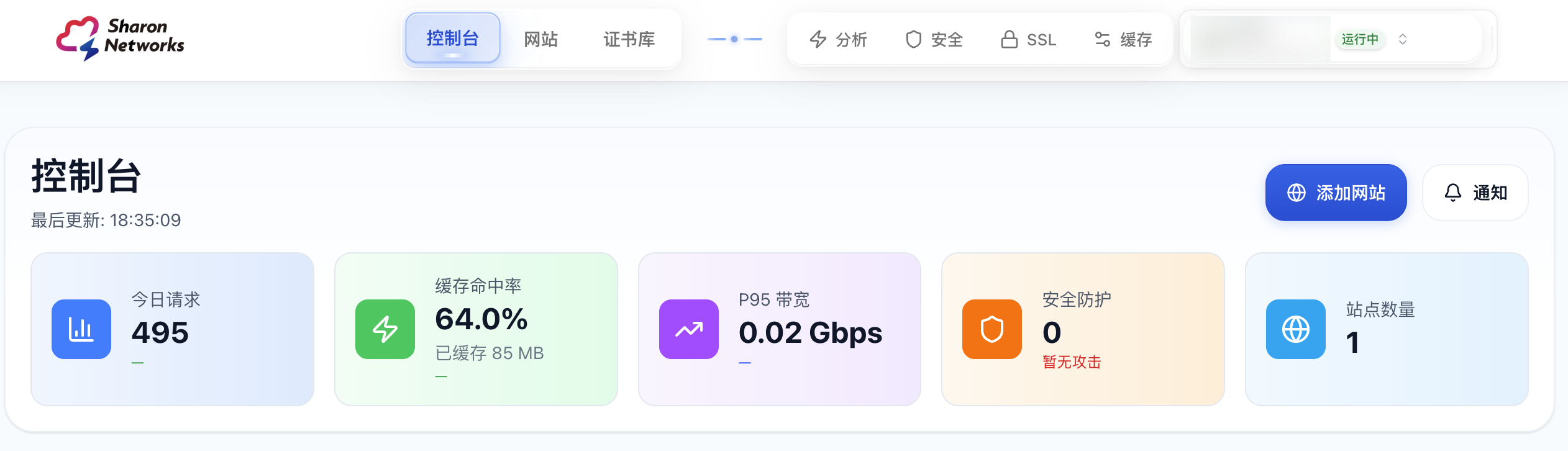 2. 第二步,进入 Sharon CDN 后台,开始配置网站,点击首页的添加网站: