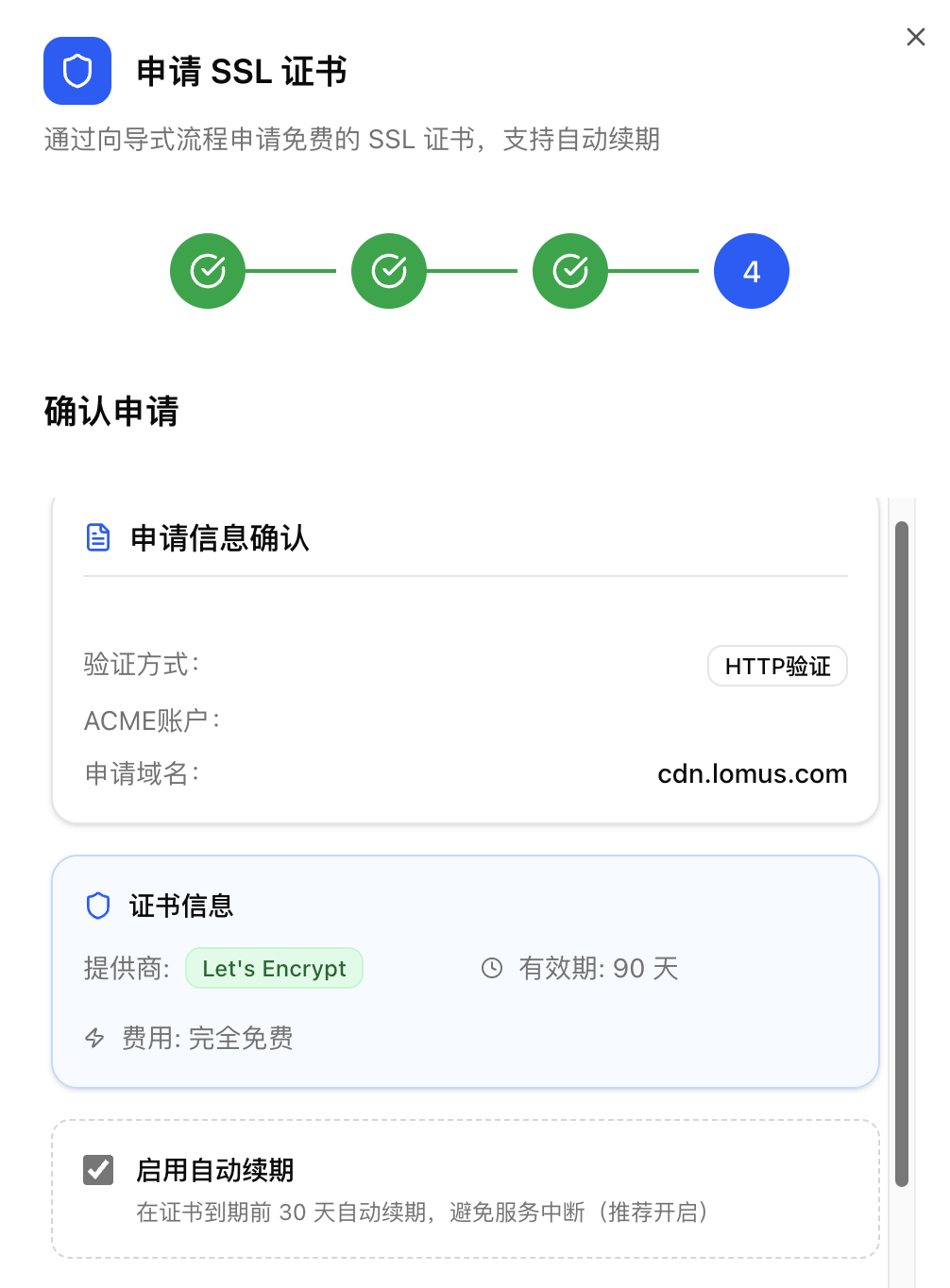 • 勾选启用自动续期,然后确认申请