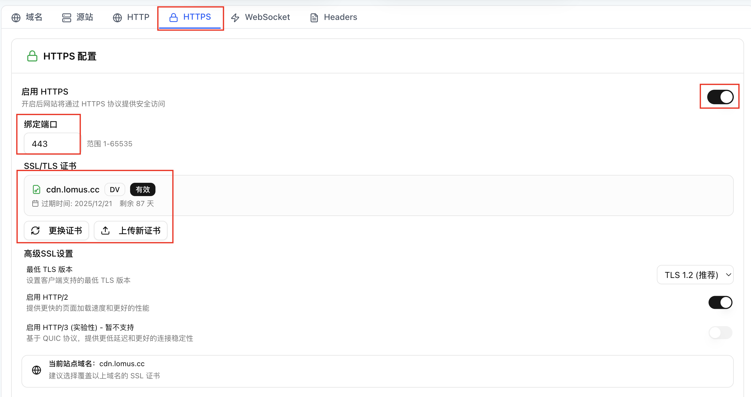 2. 点击HTTPS,然后按照下图示例,打开启用 HTTPS,端口 443,选择刚才申请好的证书