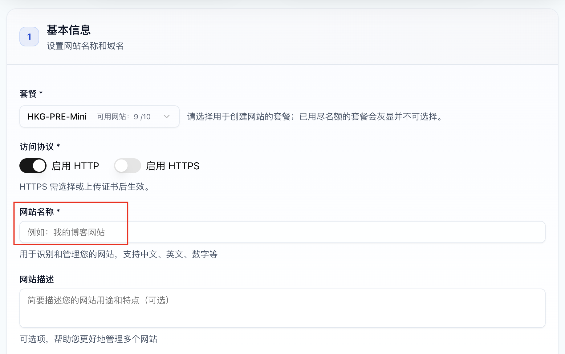 1. 填写基础的网站信息,选择购买好的套餐: