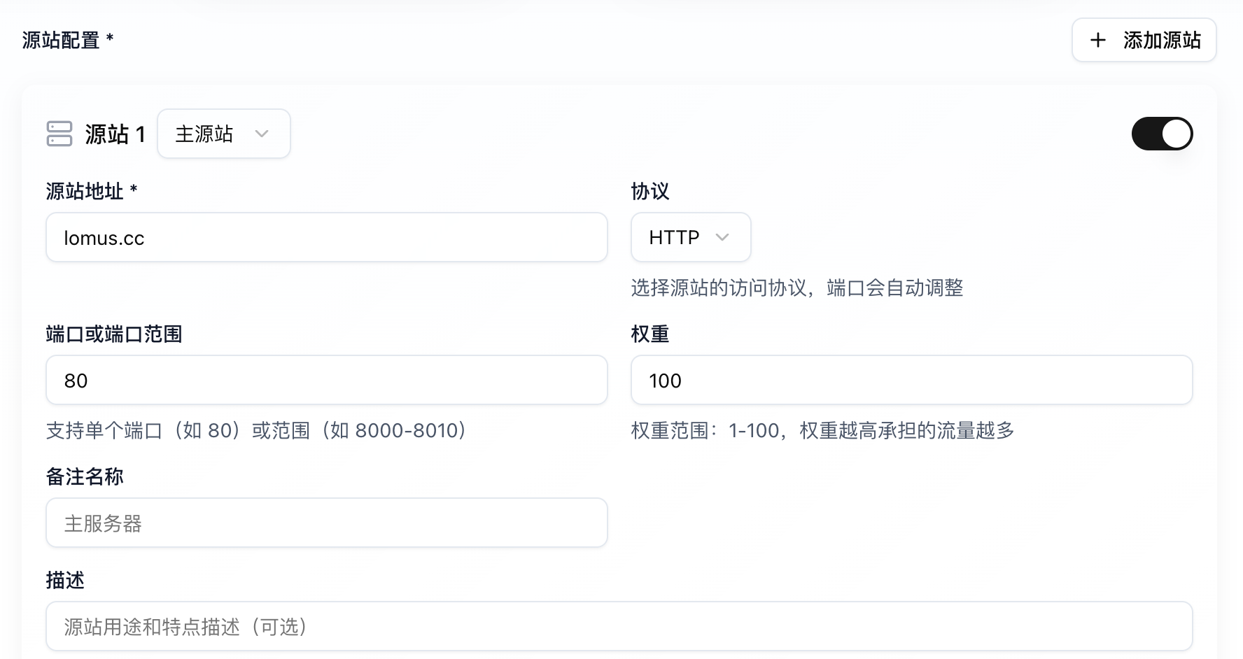 2. 但如果你前面填写的就是根域名,这里的源站地址就可以填写你的服务器 IP,协议选择 HTTP端口 80
