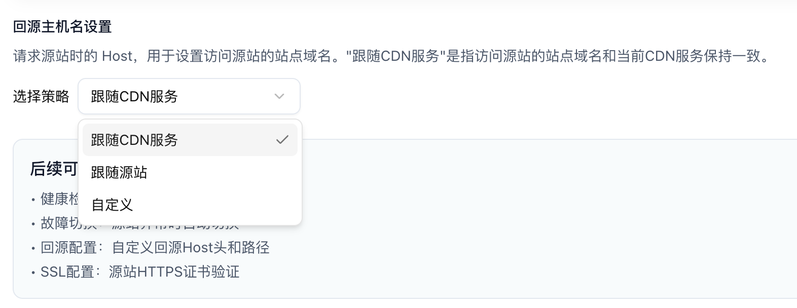 1. 如果你配置的是主域名,也就是你的 CDN 域名和源站域名一致,这里则可以选择「跟随 CDN 服务」,但如果你像我一样,CDN 配置的是子域名,则要选择跟随源站。