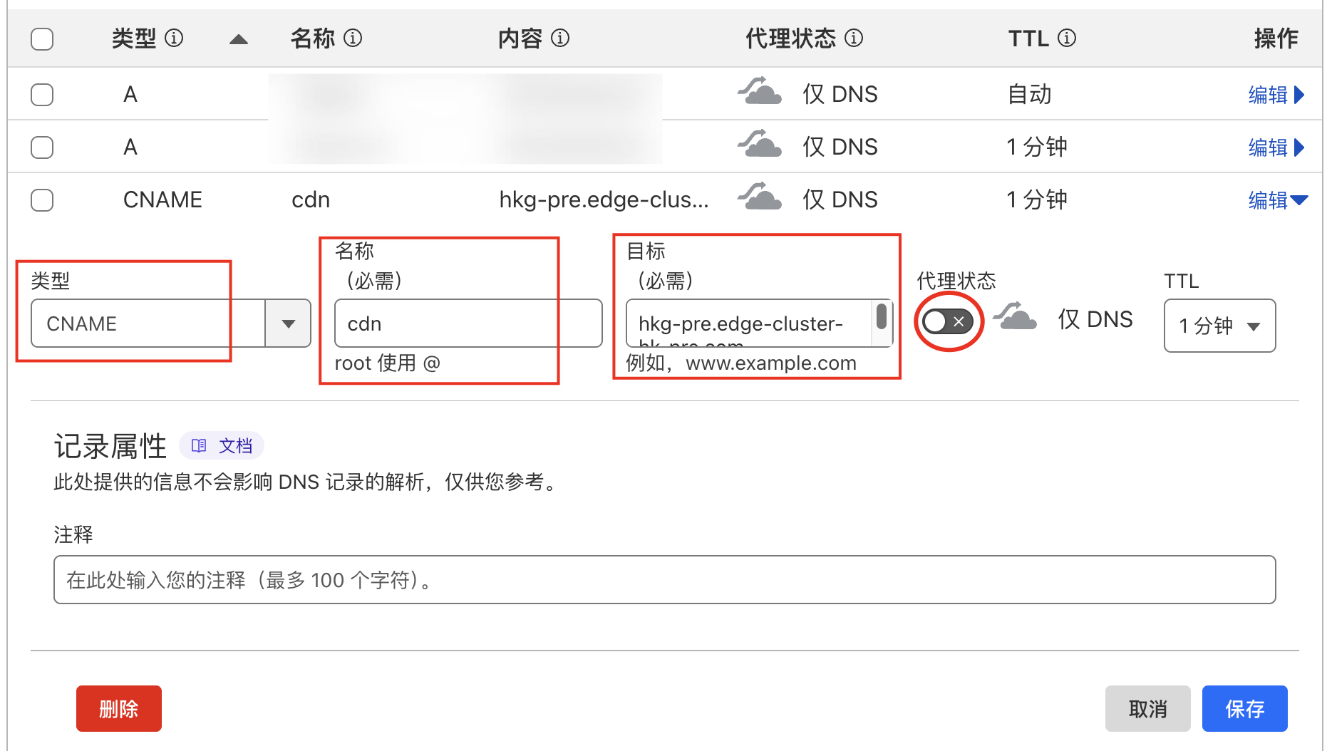 • 将刚才在 CDN 后台复制的域名,填写到内容里,代理状态保持灰色,不要打开