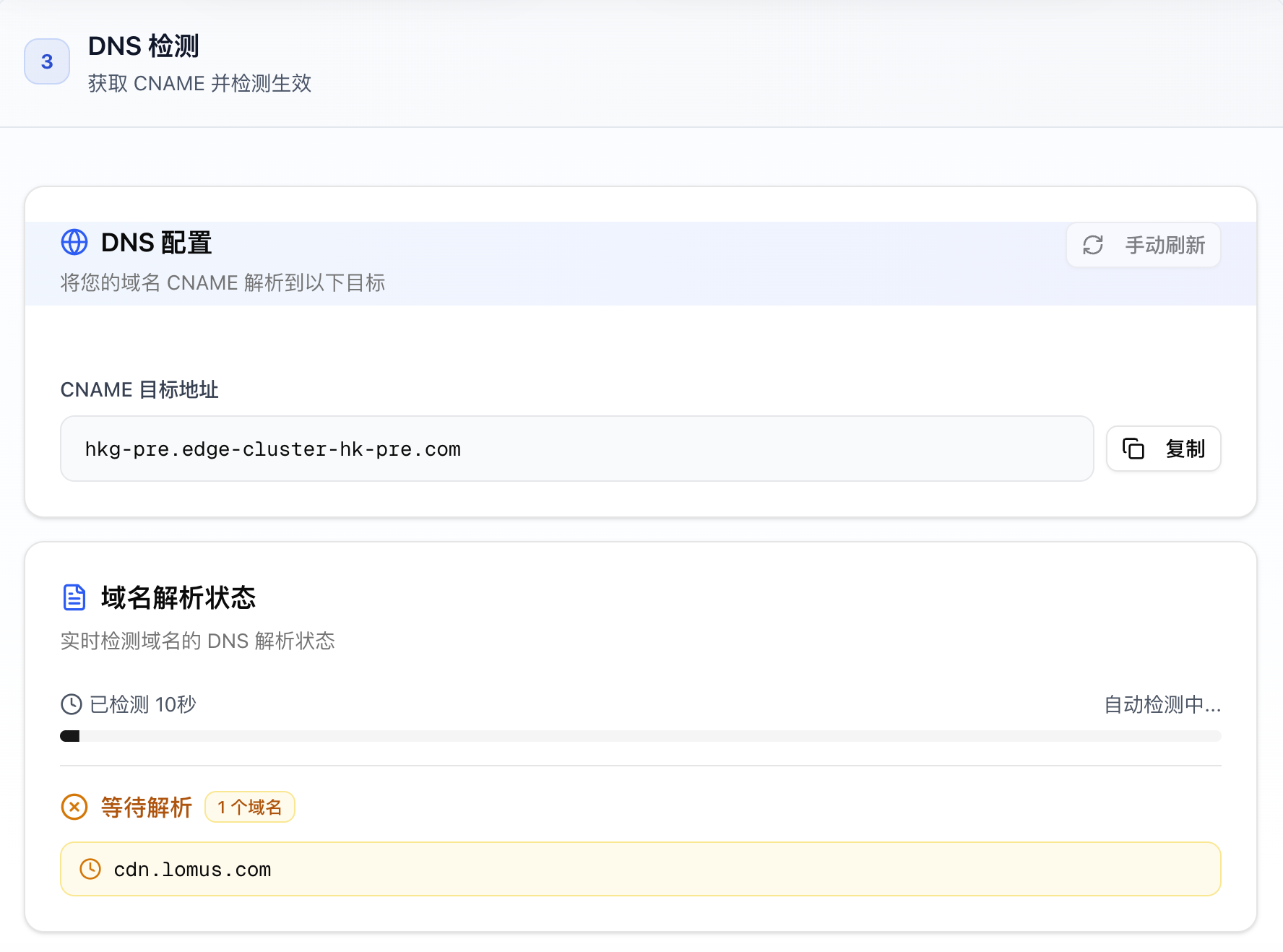 • 完成创建后,CDN 后台会显示解析状态等,如果用了 cloudfare 来解析,很可能会出现已解析成功但显示未解析的情况,这个不用担心,可以忽略,接下来我们申请网站证书。