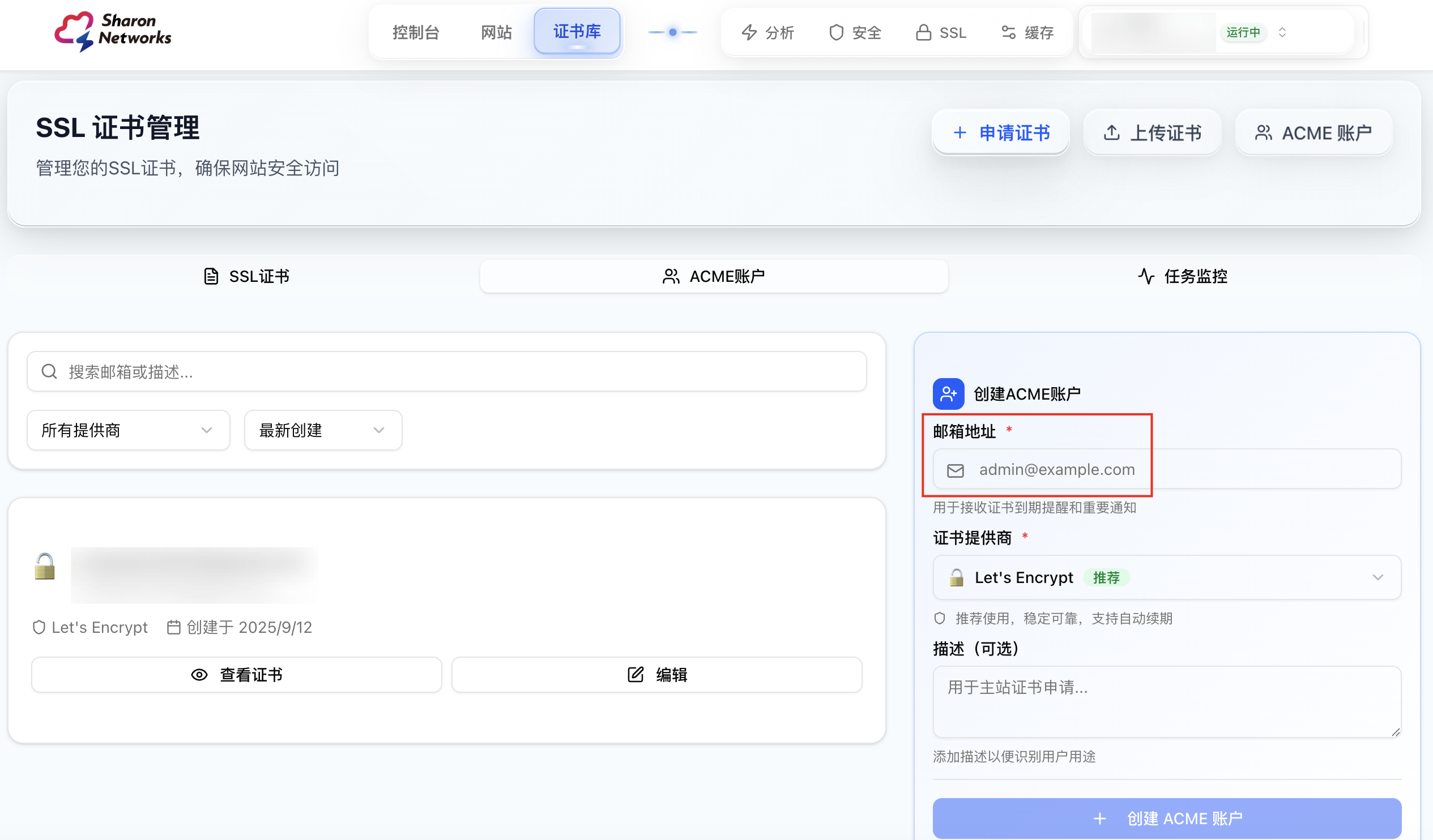 1. 点击 ACME 账户用来申请证书,先创建一个新的账户,填写自己的邮箱,点击创建